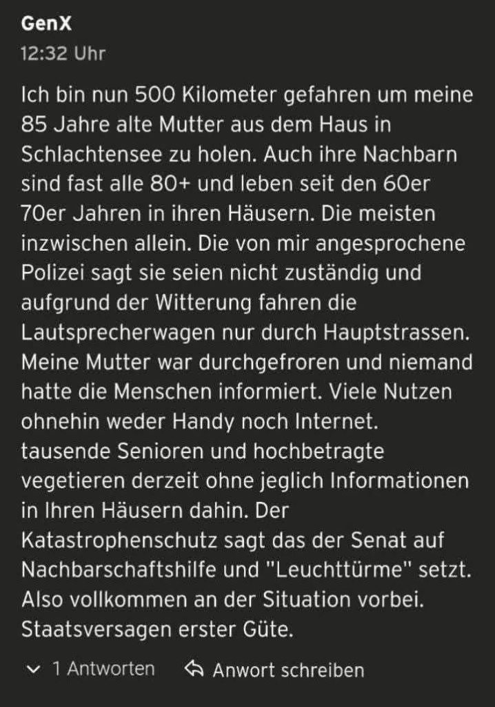 W wywiadzie dla „Junge Freiheit“ dziennikarz Christian Stoll opisuje dramatyczne godziny po nocnym załamaniu dostaw prądu i ciepła w części Berlina. Właścicielka domu, w którym Stoll mieszka ze swoją rodziną, została rano znaleziona martwa. Jak relacjonuje, kobieta jeszcze kilka dni wcześniej była aktywna, psychicznie pełna życia i fizycznie zaskakująco sprawna. W noc awarii budynek szybko się wychłodził. Następnego ranka jej brat znalazł ją bez oznak życia. Dokładna przyczyna śmierci jest na razie nieznana, Stoll stanowczo odrzuca spekulacje na temat szczegółowego przebiegu zdarzeń.