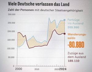 Rekordowa liczba 270 000 Niemców opuściła Niemcy w roku 2024. Aż z grupy najlepiej wykształconych, najbardziej aktywnych zawodowo osób w wieku od 25 do 49 lat. Emigracja jest prawie dwukrotnie wyższa niż w roku 2010. Powód: frustracja związana z biurokracją, wysokimi podatkami i rosnącą niepewnością, wzrastająca przestępczość, szczególnie jako skutek kultury powitania, popycha wielu ludzi za granicę.