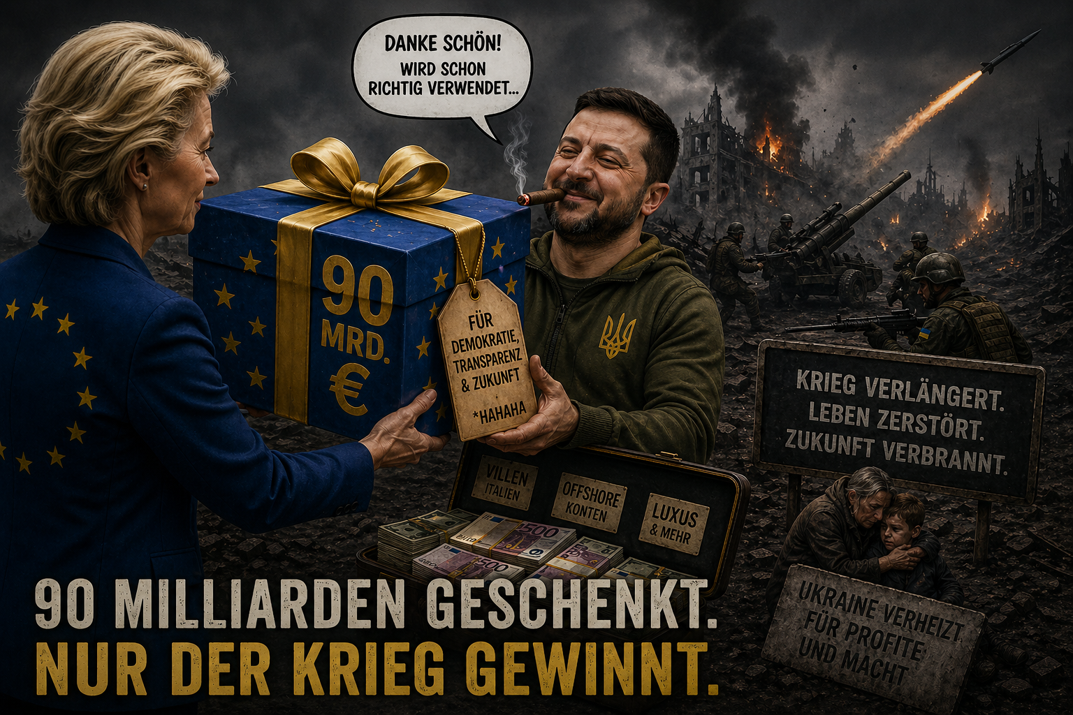 Die Trump-Administration hat festgestellt, dass etwa die Hälfte aller „Hilfszahlungen“ in die Ukraine in dubiosen Kanälen versickern. Mit den 90 Milliarden wird es nicht anders sein und es werden sich aber diesmal nicht nur ukrainische Oligarchen die Taschen vollstopfen!