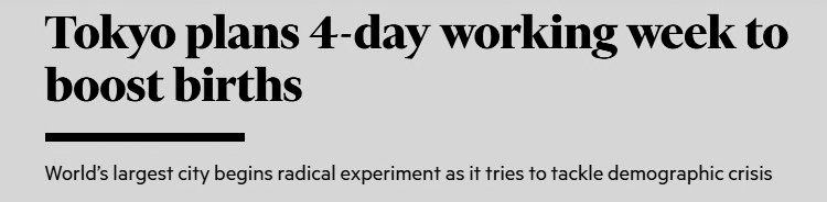 Japonia, z populacją 123,9 miliona na powierzchni 378 000 km², co daje gęstość zaludnienia wynoszącą 330 mieszkańców na km², stała się tutaj symbolem ciasnoty i życia na małej przestrzeni. Jednak Japończycy od dziesięcioleci uczestniczą w „strajku porodowym” bez programu państwowego dotyczącego kontroli urodzeń, z obecnym wskaźnikiem urodzeń wynoszącym 1,15 dziecka na kobietę. To najniższy poziom od początku rejestracji w 1947 roku, co oznacza, że ogromna populacja Japonii po raz pierwszy zmniejsza się od 2010 roku: z jej ówczesnego maksimum wynoszącego 128 milionów mieszkańców do obecnych 123,9 miliona, co oznacza spadek netto populacji o 4,1 miliona w ciągu 14 lat. Ponieważ w ogólnej populacji znajdują się również przybyli imigranci, byłby ona bez ich przybyszy jeszcze o prawie 3 miliony mniejsza. W każdym razie, na całym świecie zapanowało ujednolicone narzekanie mediów, ogłaszając „kryzys narodowy”, który należy pilnie rozwiązać. Od tego czasu zaplanowano szereg działań, które mają na celu zwiększenie wskaźnika urodzeń.