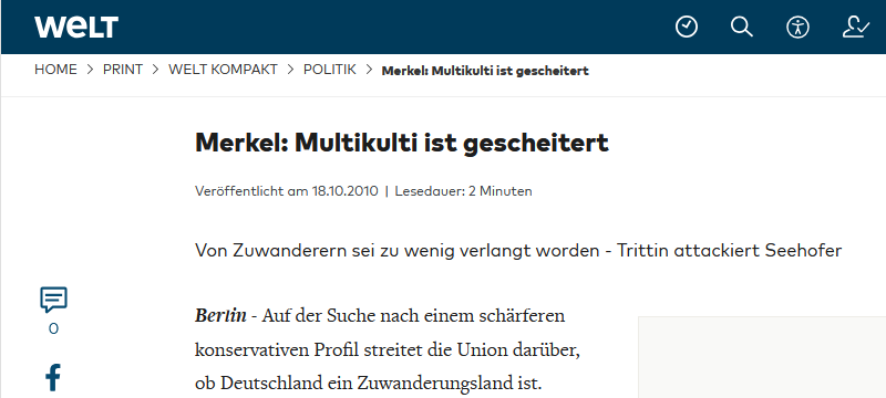 Dążenie do życia obok siebie w społeczeństwie multikulturalnym zakończyło się niepowodzeniem, powiedziała Merkel podczas Dnia Niemiec Młodej Unii. W przeszłości od migrantów wymagano zbyt mało. Jednocześnie Merkel stanęła za kontrowersyjnym stwierdzeniem prezydenta Christian Wulffa, według którego islam jest częścią Niemiec. „To jest część Niemiec – nie widać tego tylko po piłkarzu Mesut Özil”, powiedziała, odwołując się do turecko-niemieckiego gwiazdora reprezentacji.