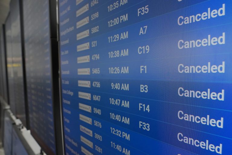 Tablica informacyjna pokazuje odwołane loty na międzynarodowym lotnisku w Filadelfii. Źródło: Matt Rourke/AP/dpa