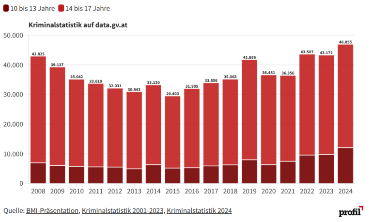 Poniedziałek, 14 kwietnia 2025: Minister Spraw Wewnętrznych Gerhard Karner (ÖVP) przedstawia oficjalne dane dotyczące zgłoszeń z ubiegłego roku. Tym razem Karner wskazuje na szczególne „dziecko problemowe”: analiza statystyki zgłoszeń na rok 2024 pokazuje „masywny wzrost przestępczości wśród młodzieży”. Minister podkreśla to grafiką ze swojego ministerstwa. Karner nie zwleka, tworzy „grupę interwencyjną do zwalczania przestępczości wśród młodzieży” i domaga się „warunków podobnych do więziennych” dla nieletnich.