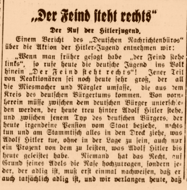 Zadziwiające jest to, że naziści również prowadzili wówczas walkę przeciwko „prawicy”. Również ta – celowo podżegająca do nienawiści przeciwko części społeczeństwa – hasło zostało przejęte przez odczuwalną lewicę dzisiaj.