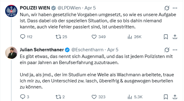 Ale kiedy, jeśli nie w czasie Wielkanocy, powinna ta zasada znaleźć swoje wyjątki w pewnych obszarach? Zaczęło się od tego, że jeden użytkownik retweetował film, na którym włoska policja osacza rzekomego przestępczego imigranta. Dodał do tego komentarz: „Tak broni się naród przed przestępczymi najeźdźcami, a nie jak nasza ‚luźna‘ policja, np. LPD Wiedeń, która działa tylko przeciwko własnemu narodowi, przeciwko starcom, dzieciom i pokojowym demonstrantom.“ Ta polemiczna krytyka wystarczyła, aby wywołać reakcję ludzi od mediów społecznościowych policji w Wiedniu.