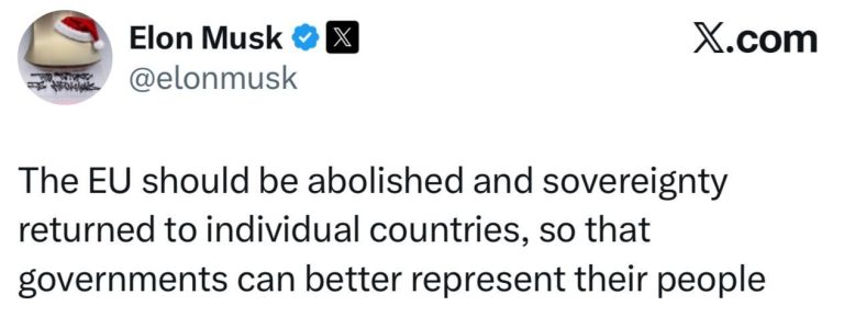 „UE musi zostać rozwiązana, a suwerenność przekazana poszczególnym krajom, aby rządy mogły lepiej reprezentować swój naród,” napisał przedsiębiorca na platformie społecznościowej X.